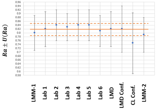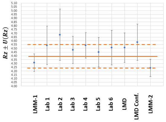 According to the results in Table 2, it is necessary to highlight that the maximum difference between and the different is 9.68% for Ra and 6.37% for Rz. If we consider the averages of the different , the difference with is 2.4% for Ra and 3.1% for Rz. As can be seen, the maximum deviation between the average value and that obtained by each of the participating laboratories was 0.08 µm, which is that of the CL confocal microscope. However, the average value is in the range for this laboratory. It also can be seen that the measurement uncertainties obtained with confocal microscopes are higher than those for stylus instruments. Theoretically, this result seems to be negative. However, the most important reading is that comparable results were found when using two measurement instruments having completely different measurement principles. This result is important since the use of optical measurement instruments is simpler than that of stylus instruments and can lead to savings for ACLs in money, time and effort.