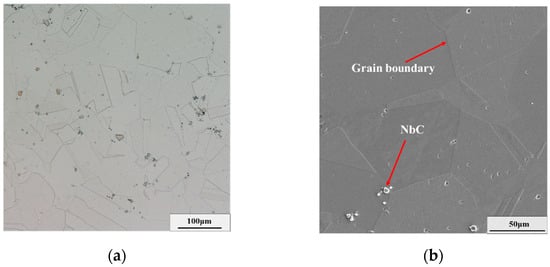 Microstructure of GH4169 superalloy after the solution treatment: (a) OM map; (b) SEM map.