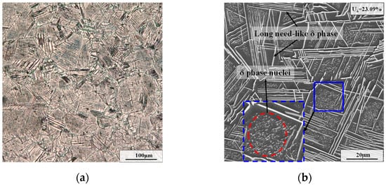 Microstructure of GH4169 superalloy after aging treatment: (a) OM map; (b) SEM map. (Uδ represents the weight fraction of the δ phase).