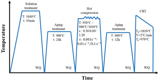 Owing to the existence of meta-dynamic recrystallization (MDRX) and SRX behaviors during annealing, the annealing treatment could serve as an efficient method to eliminate the mixed grain microstructure [18,19,20]. As a high-temperature stable phase, the δ phase (Ni3 Nb) is often used to pin grain boundary movement and act as nucleation sites for recrystallization at high temperatures [21,22,23,24]. In the authors’ previous work [25], it could be observed that the two-stage annealing treatment, which consists of an AT for precipitating some δ phases and a subsequent CRT to refine deformed mixed grains, is a valid way to eliminate the uneven deformed microstructure of an initial aged deformed GH4169 superalloy, and the mixed grains can be homogeneously refined to an average grain size of 5.82 μm under the routine of “900 °C × 12 h + 1010 °C − 2 °C/min − 970 °C”. However, the impact of deformation parameters on microstructure evolution during the new two-stage annealing process remains unclear. Generally, the diverse hot deformation parameters will cause the different initial deformed microstructures [26,27]. In addition, the initially deformed microstructures have an important influence on the microstructure evolution during annealing [28]. Hence, in-depth studies are essential to illustrate the influence of deformation parameters of an initial aged GH4169 superalloy on its microstructure evolution during the new two-stage annealing process.
