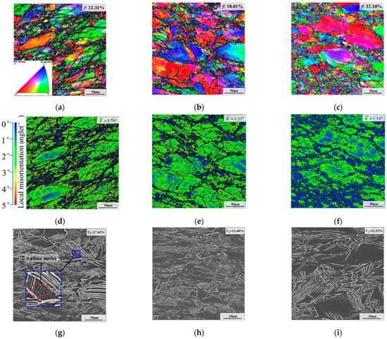Deformed microstructures with different deformation temperatures of: (a,d,g) 950 °C; (b,e,h) 980 °C; (c,f,i) 1010 °C. (The strain rate is s−1, and the true strain is 0.69. represents the average KAM value, and f represents the recrystallized fraction).