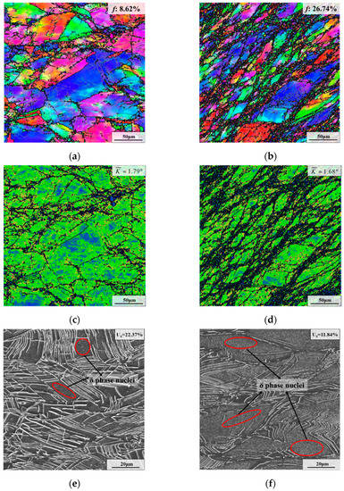 For the specimen deformed at the true strain of 0.36, the degree of recrystallization after AT was lower than that of the sample with the true strain of 1.20 (Figure 9a,b). Additionally, there was a large quantity of long needle-like δ phases and clusters of intragranular δ phases with spherical morphology before CRT, as presented in Figure 9e. The distribution and morphology of the δ phase inhibited the intragranular SRX nucleation in the early stage of CRT and the growth of previously formed recrystallized grains during CRT, thereby slowing down the recrystallization. Hence, there were still many deformed grains after CRT. In addition, there were dense shortened intragranular δ phases after CRT, as depicted in Figure 12e. That proves from the side why there are large deformed grains after CRT. As demonstrated in Figure 12c, it is noteworthy that recrystallized grains arranged in the linear pattern appeared inside the deformed grains. The main cause for this is that there were many long needle-like the δ phases running through deformed grain before CRT, causing the SRX nucleation along long needle-like phases boundary during CRT.