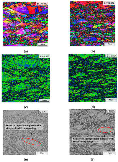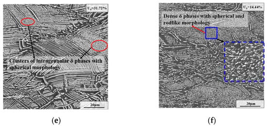 Figure 5 represents deformed microstructures with varying strain rates. According to Figure 4g and Figure 5e,f, the weight fraction of the δ phase declined from 17.62% to 16.87% and 10.98% as the strain rate decreased from 0.1 s−1 to 0.01 s−1 and 0.001 s−1. In addition, for the microstructure deformed at the strain rate of 0.001 s−1, the content of the unbroken long needle-like δ phases was lower than that at the high strain rate, and the content of the spherical and rod-like δ phases was higher. This phenomenon is mainly due to the high strain rate prolonging the dissolution time of the δ phases. Meanwhile, in Figure 4g and Figure 5e,f, the existence of intragranular δ phase nuclei in diverse strain rates can be seen.