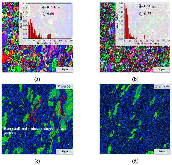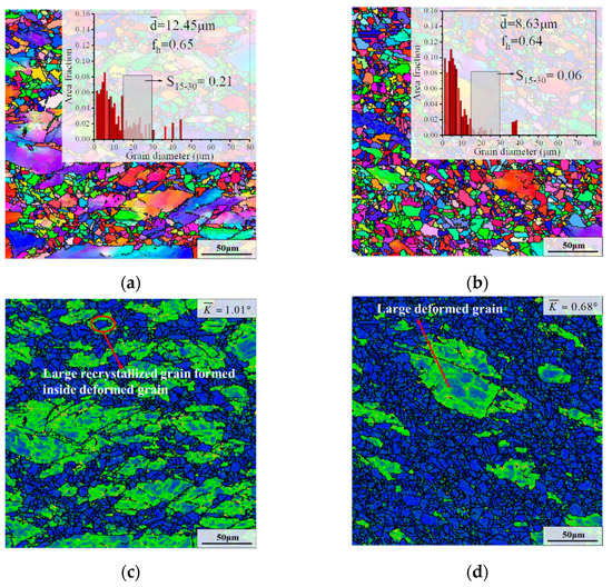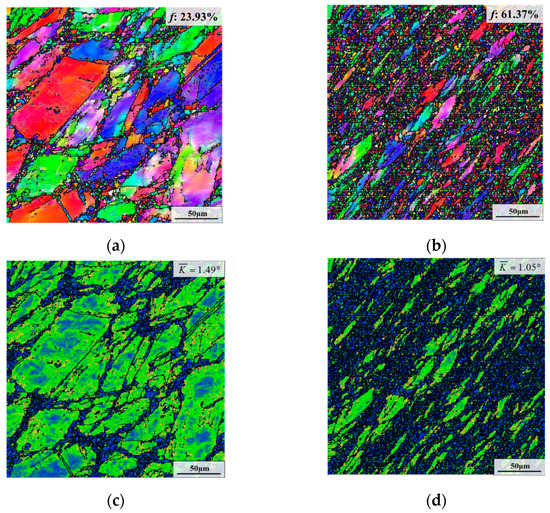 Furthermore, as shown in Figure 4a and Figure 5a,b, it can be seen that the recrystallized fraction firstly increased from 22.31% to 31.85% and decreased to 25.91% as the strain rate declined from 0.1 s−1 to 0.01 s−1 and 0.001 s−1. In addition, the size of the DRX grains increased significantly with the decrease in the strain rate due to the prolongation of the recrystallized grain growth time at a low strain rate. Meanwhile, the average KAM value decreased with the reduction in strain rate (Figure 4d and Figure 5c,d).