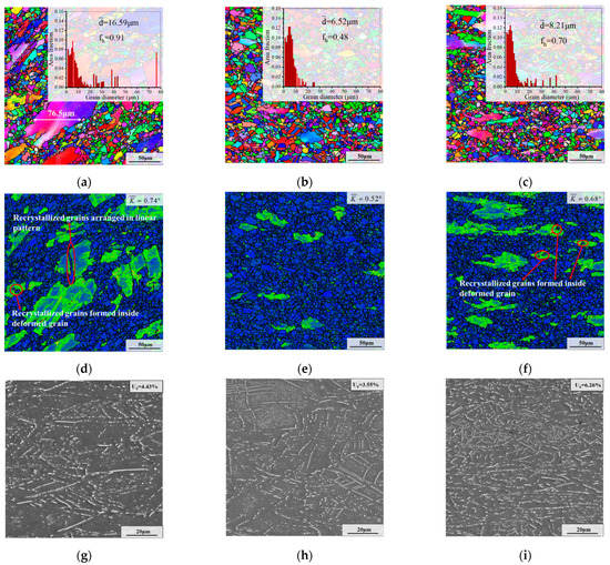 Microstructures after the first annealing stage with different deformation temperatures of: (a,d,g) 950 °C; (b,e,h) 980 °C; (c,f,i) 1010 °C. (The strain rate is 0.1 s−1, and the true strain is 0.69).