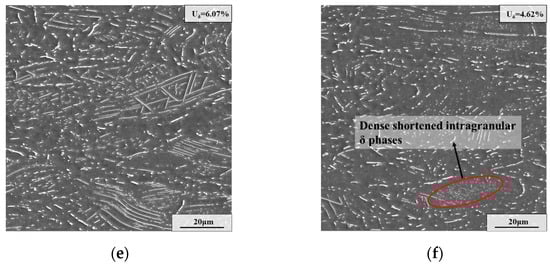 As displayed in Figure 10g and Figure 11e,f, the residual δ phase content after CRT was, respectively, 4.43%, 4.62% and 6.07%, as the strain rate declined from 0.1 s−1 to 0.01 s−1 and 0.001 s−1. As for the samples with strain rates of 0.1 s−1 and 0.001 s−1, the δ phase was mainly needle-like and rod-like. Meanwhile, the morphology of the the δ phases were primarily rodlike and spherical for the sample deformed at the strain rate of 0.01 s−1.