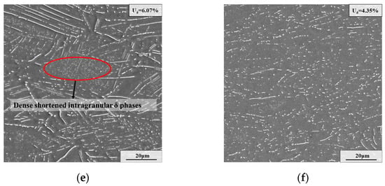 As displayed in Figure 10g and Figure 12e,f, as the true strain increased from 0.36 to 0.69 and 1.20, the residual δ phase content after CRT was 6.07%, 4.43% and 4.35%, respectively. For the samples with the true strain of 0.36 and 0.69, the δ phase were mainly needle-like and rod-like. However, the spherical δ phase dominated for the sample deformed at the true strain of 1.20.