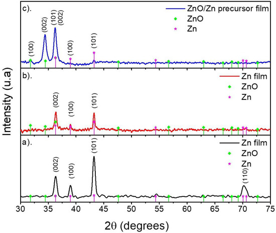 Figure 1 shows the comparison between the diffraction pattern corresponding to ZnO/Zn precursor films on the quartz substrate over the time of processing. In the early stage of precursor layer processing (Figure 1a), peaks located at 36.48, 39.14, 43.31, and 70.77 degrees were identified, which were in good agreement with the diffraction exhibited by the (002), (010), (011), and (013) planes for the hexagonal zinc phase, respectively (reference code: COD-00-04-0831) [36]. We could observe the absence of ZnO peaks, which implied that the as-deposited Zn layer was obtained without additional phases. Then, in the middle stage of precursor layer processing (Figure 1b), an increment in the relationship of (002) plane intensity and that exhibited by the other planes was observed. This could be attributed to the presence of ZnO due to the diffraction of the plane (101) located at 36.49 degrees. The previous suggestion was reinforced by the final stage of precursor layer processing (Figure 1c) because the diffraction of the planes (100), (002), and (101) attributed to hexagonal wurtzite ZnO could be distinguished based on their locations at 31,82, 34.33, and 36.49 degrees, respectively (reference pattern: COD-00-36-1451). The diffraction of the (002), (010), and (011) planes (previously attributed to Zn) suggested the co-existence of metallic zinc and ZnO. The presence of both phases confirmed the existence of the Zn/ZnO precursor layer (see Figure S1).