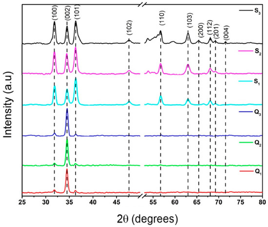 XRD patterns of the ZnO films—supported on quartz (Q1–Q3) and Si (S1–S3) substrates—obtained through the sublimation of ZnO from the ZnO/Zn precursor films at different temperatures.