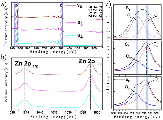 According to the XPS measurements, the stoichiometry of the samples was in good agreement with the phase identified in the XRD results. In addition, the samples were obtained with a high control in purity due to O and Zn being the unique elements present in the ZnO film (see Figure 3a). The comparison between the XPS spectra of the Zn on the Si substrate after thermal oxidation processed at 600, 700, and 800 °C revealed no significant shifting in the Zn2p3/2 and Zn2p1/2 energy bands (EBs), which were placed at 1022.8 and 1045.8 eV, respectively (Figure 3b). The constant difference of 23 eV between the Zn2p3/2 and Zn2p1/2 bands suggested a dense population in Zn2+ [41]. Notice that, typically, Zn presents a smaller energy value in the Zn2p3/2 EB than that observed in our samples; this confirms that samples have oxygen-deficient ZnO1-x and that Zn is present only in an oxidized state [42]. Thus, the presented method allowed us to obtain a full Zn-oxidized film even when we used a Zn layer as a precursor in the synthesis. In addition, it is known that the O1s EB is composed of oxygen vacancies (OV), chemisorbed oxygen (OC), and lattice oxygen vacancies (OL) [43,44]. Thus, the components of the O1s EB were determined by applying a Gaussian fitting on the XPS spectra (Figure 3c); for the S4 sample, the OL and OV were found at 530.17 and 531.97 eV, respectively. For the S5 sample, the OL was located at 530.66 eV and the OV was located at 532.02 eV, while in sample S6, the same O1s EB components (OL and OV) were found at 530.67 and 532.37 eV, respectively. Note that in all samples, both OL and OV were found in different intensities; this could be related to the synthesis temperature, since it was observed that temperature had a direct influence on the structural properties of ZnO [45]. The variation in OV intensity demonstrated different oxygen vacancy concentrations in the samples. To measure this concentration, the percentage contributions of oxygen vacancies in the O1s EB were calculated as 59.82%, 38.69%, and 41.92% for S4, S5, and S6, respectively. This suggested that the treatment at 600 °C promoted the highest concentration of oxygen vacancies on ZnO. As can be seen in Figure 3c, the O1S shifted across the samples, and it was proposed that the change in oxygen-deficient states was responsible for this shifting [46].
