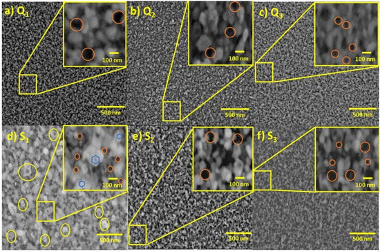 Notably, the ZnO films supported on quartz substrates showed porous surface structures with high densities. After the low-temperature processing at 600 °C, relatively large and nearly spherical particles were observed on the film surfaces, whereas after the high-temperature processing at 800 °C, fiber-like structures were observed on the film surfaces on both of the substrates (Figure 6). In particular, the surface of sample S1 showed a uniform distribution of hexagonal nut-like nanostructures with a cavity at the center, indicated by yellow circles in Figure 6d. Such structures are clearly distinguishable because of their large sizes, and their formation can be attributed to the orientation of the substrate [23] and the processing temperature of the film [62]. As the Si wafers belong to the cubic crystalline system and the ZnO belongs to the hexagonal system, the lattice mismatch between ZnO and Si could be highly responsible for the hexagonal structures [23]. For samples S2 and S3, hollow-like particles were observed, but only at higher magnifications (see Figure S3). The different ZnO film microstructures that were observed in this study resulted from the amorphous and crystalline substrates.