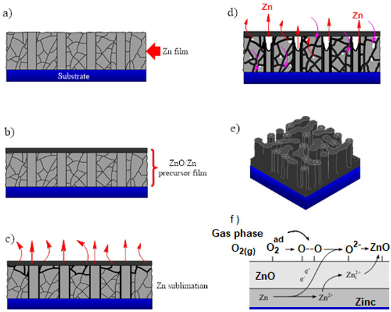 The Zn atoms from the zinc film migrate towards surface reaction sites located on the ZnO crystallite seeds. The sublimation rate can also be enhanced by increasing the processing temperature, the microstructure of the ZnO nanofilm, and the concentration of various oxidizing gas species—H2O or CO2. The formation of nanopores is the result of the sublimation of Zn through the film’s structural defects or the grain boundaries located in the ZnO/Zn precursor film; the zinc migration can be enriched by increasing the processing temperature due to the high surface diffusivity of Zn over the ZnO seeds (see Figure 7d). The ZnO crystallite formation induces ZnO surface fracture due to the polycrystalline nature of the ZnO/Zn precursor film. The pore diameter is related to the initial thickness of the Zn film, the processing temperature, and the substrate’s nature. The presence of hexagonal features on the film surface reveals the incidence of the wurtzite phase of the ZnO films (see Figure 7e). In Figure 7f, a scheme is proposed to illustrate the possible path followed by Zn to obtain ZnO in the present procedure. Thus, the Zn diffuses through the ZnO/Zn precursor film to interact with oxygen atoms (from the atmosphere and into the process) to leave the formation of ZnO structures. In addition, the fact that the melting point of Zn is under 450 °C seems to be an important property for obtaining ZnO micro-/nano-structures in thermal-oxidation-related processes [36]. The importance of this property in the above-described mechanism is under discussion. Even though similar works have been reported [23,65], this work contributes novelty by giving experimental evidence of the importance of a ZnO/Zn precursor film for the obtention of a porous ZnO layer from pure Zn deposition, which could be a strategy for increasing the accessibility of the sublimation methodology for nanoporous ZnO film fabrication.