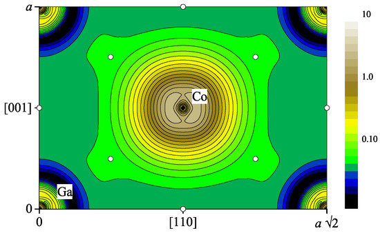 A more detailed analysis of the total charge density including the core level was performed by using Bader’s [33] quantum theory of atoms in molecules and solids (QTAIMS) analysis, based on Critic2 [34,35]. The topology of the charge density is characterized by critical points where has an extremal value, that is for . Overall, eight different critical points were found as summarized in Table 1. These are the two nuclei, three bonds, two rings, and one cage-critical point. Naturally, the electron distribution has local maxima at the nuclei. The electron density is expected to be high in this region due to the tightly bounded core electrons. Two of the bond-critical points are located halfway between the Co or Ga atoms, whereas the third one is found along the [111] axis between Co and Ga, slightly closer to Ga. The 12-fold degenerate cage-critical point, that is the absolute minimum of the total charge density, is found close to the Ga atoms. It should be noted that the cage-critical point is not located in the (110) plane drawn in Figure 2.