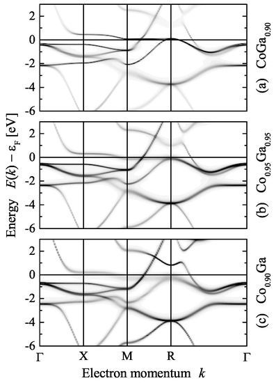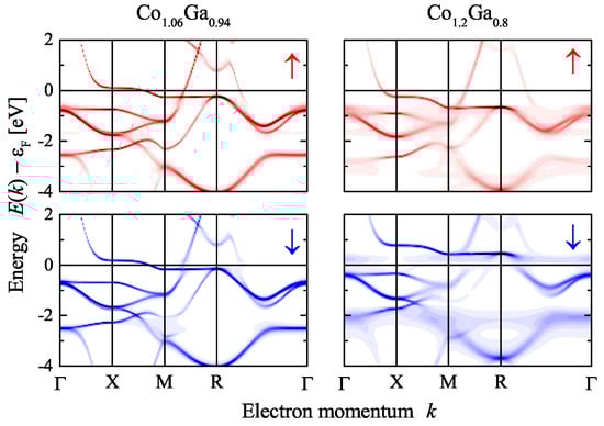 The situation changes at higher Co content where a much larger magnetic exchange splitting is observed. In addition, the broadening of the states by chemical disorder scattering is more pronounced. At 20% Co excess, the majority conduction band crosses the Fermi energy in the direction. Furthermore, the minority band that initially crossed the Fermi energy between M and R is now shifted completely above it. The differences in the electronic structure shown for the case of the Bloch spectral function in Figure 8 explain the discontinuity of the magnetic moments. The number of valence electrons increases with Co content. Here it is assumed that for Co 9 and for Ga 3 electrons per atom contribute to the valence electron concentration. An increase in the valence electron concentration leads to an increase of the exchange splitting of the states. At a certain point, the flat majority band at X along and/or the flat minority band between M and R will touch the Fermi energy. This leads to an instability. At low Co excess (below 10%), the system is stable in the low moment state where both bands are above/below the Fermi energy. Above , the enhanced exchange splitting—forced by the localized moment of the additional Co atoms in the position—causes the system to turn into the high moment state.