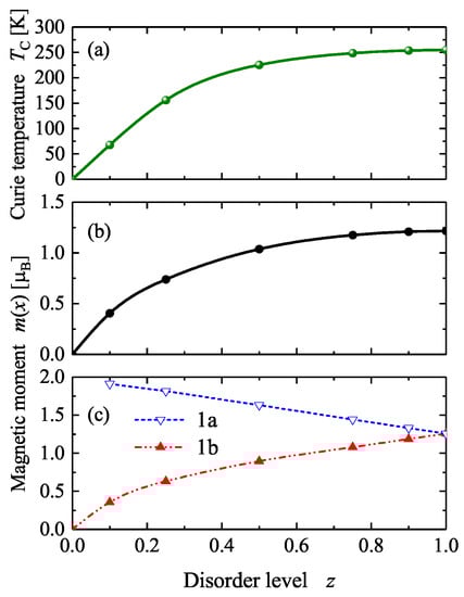The magnetic properties of the disordered CoGa are summarized in Figure 5. The total magnetic moment in the primitive cell increased non-linearly from zero to about 1.2 . This is a different behavior than that of a mixture of two different compounds with and type structures. In that case, the magnetic moment would increase linearly from zero to the maximum at a 1:1 mixture. The non-linear behavior is attributable to the different magnetic moments of the Co atoms on the two non-equivalent sites. The moment at the Co replacing Ga decreases linearly whereas the moment at the Co atoms on the initial site increases non-linearly until both are finally equivalent in the type structure. Furthermore, it was found that the Curie temperature increased with disorder in a non-linear manner, similar to the total magnetic moment. Its value reached a maximum of approximately 250 K in the completely disordered structure. However, an analysis of the exchange coupling constants revealed that the spin stiffness was nearly constant with a value of about (225 ± 10) meVÅ.