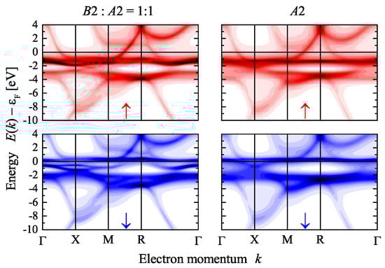 Figure 6 compares the Bloch spectral functions of disordered CoGa for the structure with and the structure. The electronic structure is similar in both cases; however, the broadening of the states by chemical disorder scattering is different. The magnetic exchange in the disordered CoGa splits the initial band structure of the ordered compound (see Figure 3) into majority and minority states. The exchange splitting shifts the majority states arising from the flat band between X and M below the Fermi energy. As a side effect, a majority band crossed the direction between and X. This band changes the transport properties, in particular, for majority electrons. The minority Bloch spectral function exhibits flat bands just above the Fermi energy.