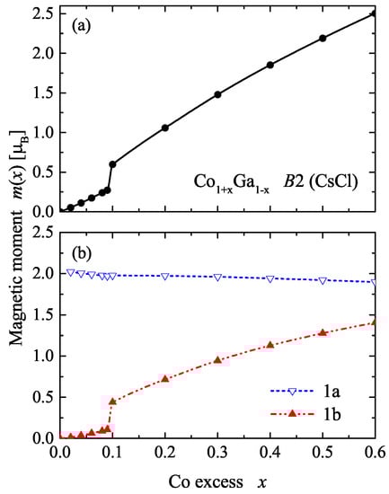 Changes of the composition may have a wide range of consequences. The two sites of the structure may either be fully occupied or vacancies may appear on one of the sites. The effect of vacancies was already discussed in Section 2.2, where it was shown that they do not lead to magnetic order. If x is the deviation from the 1:1 stoichiometry, then the first type results in the Co:Ga composition :. In this situation, the excess Co atoms occupy the Ga site, which might be expressed as Co(CoGa). Unlike the situation where vacancies are present, the aforementioned case results in two non-equivalent Co atoms which leads to ferromagnetic order at high enough Co content.