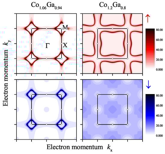 Fermi surface of -CoGa. Shown are spin-resolved Bloch spectral functions in the (001) plane of the Fermi surface for (left) and (right). The arrows ↑ (upper row) and ↓ (lower row) assign majority and minority states, respectively.
