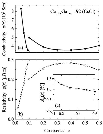- Yakhmi, J.V. Electrical resistivity of beta CoxGa1−x. J. Phys. F Met. Phys. 1983, 13, 659. [Google Scholar] [CrossRef]