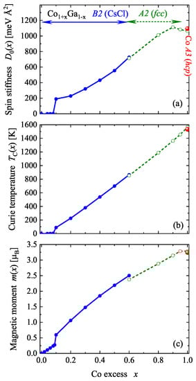 The spin stiffness exhibits discontinuities at medium (small x) and very high Co content. In the ferromagnetic range, it increased nonlinearly from 200 to almost 1100 meVÅ. Moreover, its behavior in the continuous region is different from that of the Curie temperature or magnetic moment. The Curie temperature exhibits a nearly linear dependence on the Co content from the onset of ferromagnetic order up to pure Co. It should be mentioned that the Curie temperatures for and Co are nearly identical (difficult to distinguish in Figure 11). At about 1550 K, the calculated mean field Curie temperature of Co is approximately 10% higher, compared to the experimental value of ≈1400 K. The mean field values of the high moment states in the vicinity of are similar to the experimental values reported in references [25,43,44]. Such deviations may be caused by partial disorder in the samples [45,46] that was not accounted for in the present calculations. It should be noted that large differences appear between the results of the various reported experiments. The magnetic moment increases above in a non-linear but nearly continuous manner. The magnetization does not follow the Slater–Pauling rule for localized ferromagnetic systems, but is on the borderline when its behavior is compared to that of itinerant ferromagnets [47,48]. However, the Curie temperature behaves similarly to that of the Co-based Heusler compounds, even though the binary Co-Ga system is not half-metallic [49]. As mentioned above in Section 2.4, a small moment is observed for . In this compositional range, the Curie temperature is very small (below 5 K) and changes discontinuously to 90 K at .