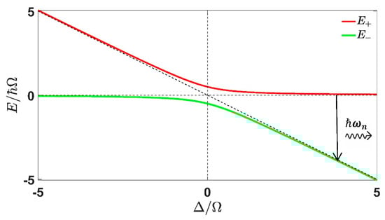 Equation (27) represents the transition rate from the lower dressed state to the upper dressed state, the energy gap between the two dressed states is Ω Δ = Ω 2 + Δ 2 (the energy gap depends on applied field strength and detuning). When this gap is equal to one of the confined LO phonon modes then phonon-assisted transitions can result in transitions. And as pointed out in the previous section, that the final state will have more excitonic character if Δ Ω 1 when Δ > 0 (see Figure 2). Such exciton occupancy in the final state (lower dressed state) is given by: