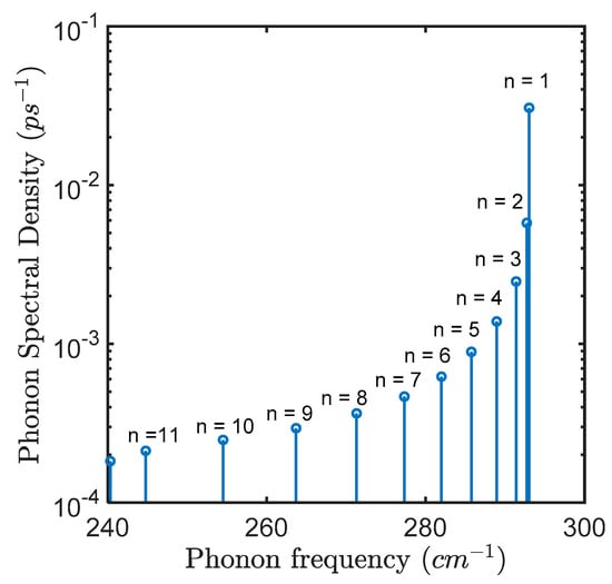 In Figure 3, we plot the discrete phonon spectral density corresponding to all 12 modes (whose discrete dispersion is shown in Figure 1). As we can see that corresponding to n = 1 mode which is near the zone center of the Brillouin zone has the highest magnitude of 0.031 ps 1 of all the modes.