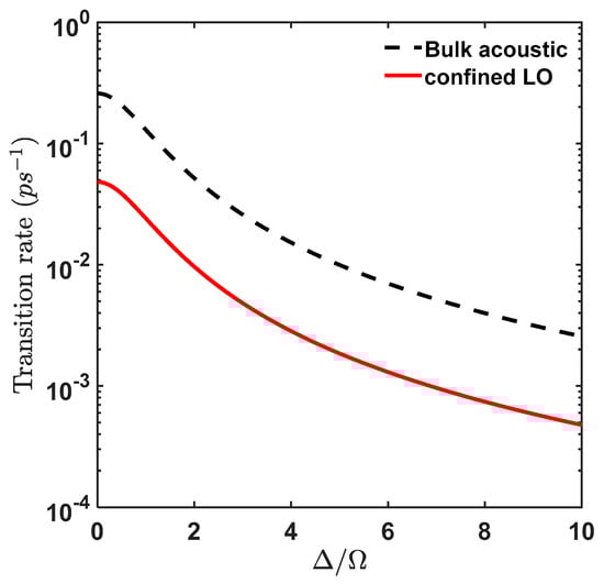 Using this value in Equation (30), we find the maximum transition rate for acoustic phonon as a function of Δ / Ω in Figure 5 (black dashed):