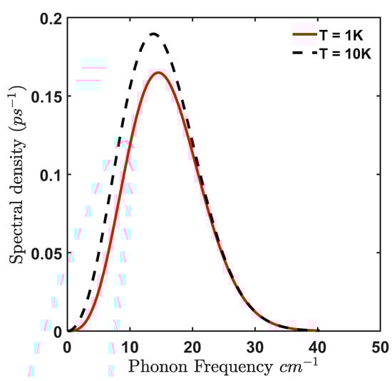where, D e / h is the electron/hole deformation potential, ρ d is the material density, c L A is the acoustic speed corresponding to longitudinal acoustic (LA) mode. We find that the acoustic spectral density peaks at ω = 14.61   cm 1 with a peak value of 0.1649 ps 1 at T = 1 K (see Figure 6).