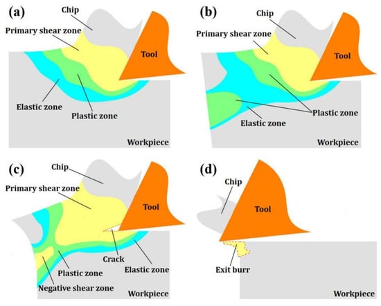During machining, the primary shear zone, plastic zone and elastic zone of the workpiece material are formed by the extrusion and shearing of the cutting edge (Figure 1a). As the tool moves towards the edge of the workpiece, the elastic zone and the plastic zone reach the edge of the workpiece, respectively. At the same time, bending deformation occurs at the workpiece edge. The plastic deformation then extends to mix with other plastic deformation zones at the workpiece boundary (Figure 1b). Then, as the cutting progresses, crack will be created in the primary shear zone, and continue to extend along the cutting line due to the shear force. At the same time, a negative shear zone is generated at the material edge (Figure 1c). The crack separates the chip along the cutting line, and the exit burr is left on the edge of machined workpiece surface (Figure 1d).