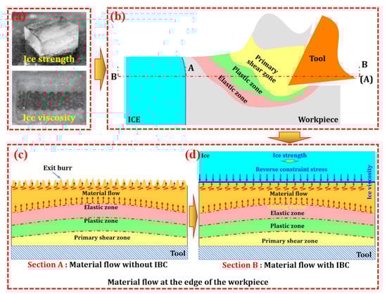 The principle of IBC method: (a) The strength and viscosity of ice; (b) Schematic diagram of IBC (A represents section A; B represents section B); (c) Material flow at the edge of the workpiece; (d) Material flow at the edge of the workpiece under IBC.