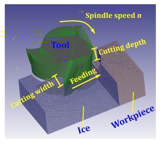 In the simulation, a volume of ice is placed on the edge of the workpiece to suppress exit burrs (Figure 3). The boundary conditions are listed in Table 6. The size of the workpiece is 8 mm × 4 mm × 4 mm, the size of the ice is 8 mm × 11 mm × 4 mm, and the initial temperature of ice is −20 °C. The tool used is a three-blade milling cutter, made of tungsten steel carbide. The radial depths of cut are 1 mm and 2 mm. The axial depth of cut is 2 mm. The spindle speed is 4000 r/min and 5000 r/min.
