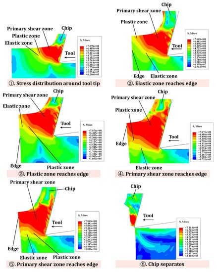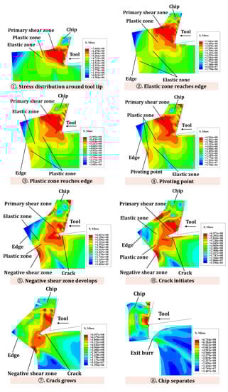 Figure 6 shows the stress distribution and flow state at the edge of the workpiece with IBC. Stage 1 shows the state of stress distribution of the material around the tool tip. In stages 2–3, the elastic zone and the plastic zone reach the edge of the workpiece, respectively. Stage 4 describes that the primary shear zone around the tool tip gradually moves to the edge of the workpiece, and the workpiece material is slightly deformed. Stage 5 is the process in which the primary shear zone extends along the edge of the workpiece. In stage 6, the chips are separated from the workpiece material, and exit burrs are significantly suppressed.