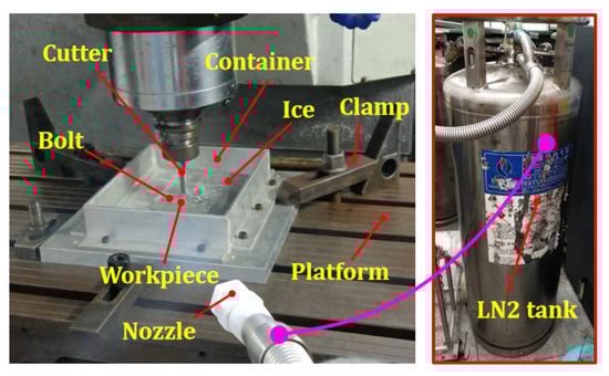 The experimental verification was carried out on the KVC850M machine. The experimental setup mainly includes a container, bolts, clamps, a refrigerator, nozzle and LN2 tank (Figure 7). Among them, the bolts are to fix the workpiece in the container. The container is used to hold water. Clamps are used to fix the container to the machine platform. The refrigerator is for freezing water. The nozzle and LN2 tank form a cooling system to cool the machining process.