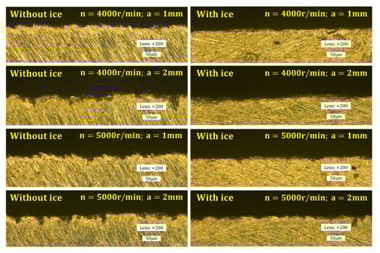 Although the exit burr is greatly suppressed, it still exists. The main reasons are as follows: (i) the freezing temperature in this study is −20 °C, and at this temperature, the strength of ice is not well matched with the cutting load; (ii) during freezing or machining, ice may produces cracks, which reduces the constraint effect of the ice on the edge of the part; (iii) due to the presence of air in water, tiny air bubbles will be generated at the ice–workpiece interface after freezing, thereby reducing the constraint effect of ice on the edge of the workpiece.
