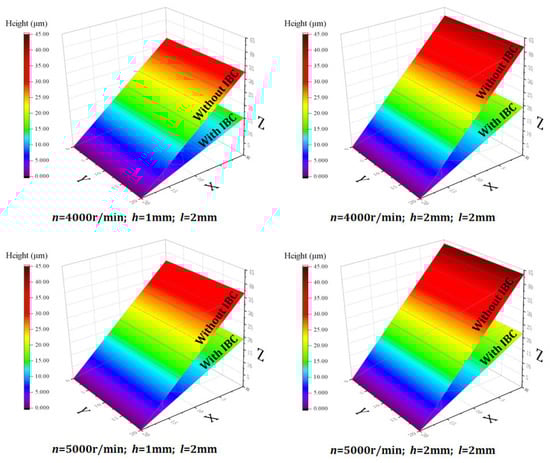 According to the simulation results (Figure 4), it can be seen that the IBC method can effectively suppress the formation of exit burrs under different cutting parameters, thereby improving the quality of the workpiece edge and the integrity of the machined surface. In addition, the suppression effect of the IBC method on the exit burrs is less affected by the variation in cutting parameters.