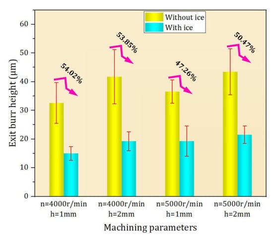 The workpiece edge topography was measured by a Keyence ultra-depth three-dimensional microscope. The measurement results show that compared with conventional machining, the IBC method can effectively improve the edge quality of the workpiece (Figure 8) and reduce the exit burr height (Figure 9). Moreover, the quality of workpiece edge changes significantly with the change in cutting parameters under conventional machining, while the quality of workpiece edge is less affected by the change in cutting parameters under IBC.