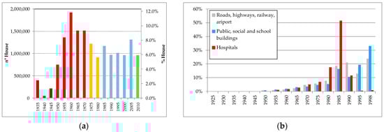 Residential buildings and main civil engineering works: (a) distribution according to age of the houses built; different colors refer to different Italian codes and/or new and significant seismic classification; (b) distribution of financial resources for engineering works that are totally or partially state-funded (source: www.istat.it (accessed on 24 January 2022)).