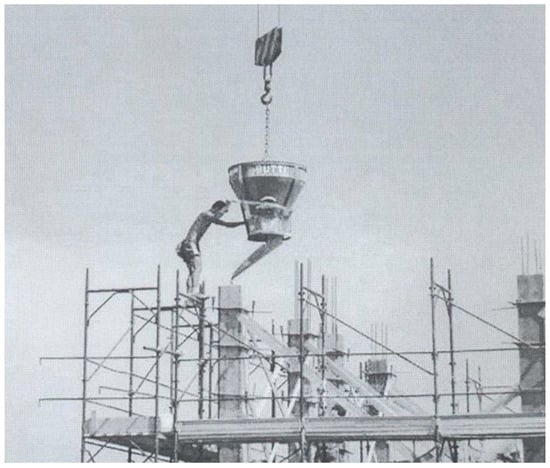 In the current Italian code, the part dedicated to the existing constructions is reported in chapter 8 which contains the general principles and the main issues of existing constructions; even though significant options and choices are left up to the professional’s practice. More quantitative details are reported in the guidelines [10] which address the issues that support the professionals in acquiring the quantitative and qualitative information necessary for a broader knowledge of the existing characteristics of the building. The most significant differences that the recent codes have introduced for the assessment of existing constructions are in the: (i) geometry, (ii) construction details and (iii) materials. These parameters condition the assessment step and the subsequent intervention strategy. The third element (material characterization) plays a fundamental role, especially with regard to the concrete used in reinforced concrete structures. Strong differences and variability in the mechanical characteristics of materials, in particular with regard to concrete, were verified on many existing structures [11,12,13]. The concrete is often of a lower quality than expected. Under such conditions, the most widespread testing methodologies may not be effective due to several factors. First of all, the results of the tests depend on various factors such as specific weight, water/cement ratio, aggregate/cement ratio, type of aggregate, percentage of humidity, and presence of reinforcements. These factors are well known and extensively studied (for example, [14]). Moreover, other factors that are specific to old constructions can affect the results of the tests: the age of the concrete, the original construction procedures namely pouring, compacting, curing, quality controls (Figure 2), the period of service, the effects of the degradation induced by the environment and use, the effects of damage due to earthquakes and other actions and loads.