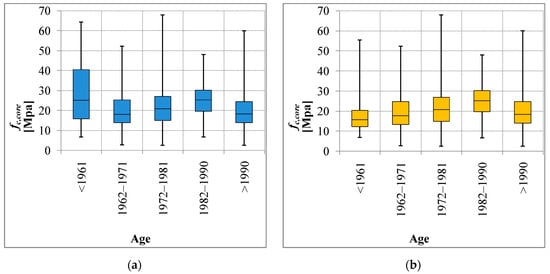 fc,core—Age comparison with (a) or without (b) civil engineering works. Each box encloses 50% of the data with the median value of the maximum fc,core displayed as a thin line, within the box; the top and the bottom of the box, respectively, mark the 25% and 75% limits of the population; outside the box, the whiskers represent the maximum and minimum values of the population, respectively.