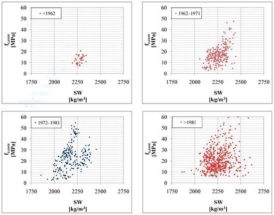 Furthermore, the SW—fc,core relationship is analyzed. Some SW values seem to be of critical value for compressive strength and, in some cases (on single buildings), it is possible to identify a clear correlation between SW and compressive strength. However, contrary to expectations, there is no clear and generalizable relationship between SW and compressive strength, as is reported in Figure 7 for different age of concrete based on the design code and available data.