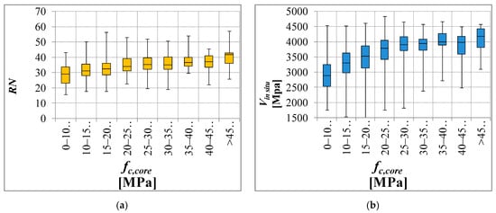 Box plot of NDT variability for several compressive strength classes: rebound number (a) and ultrasonic velocity tests (b).
