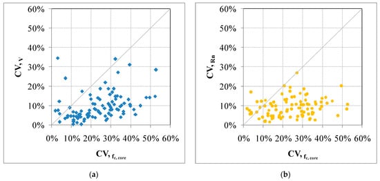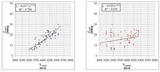 In Figure 13a, for those buildings under investigation, the relationships between Vc,core-fc,core are reported; whereas in Figure 13b, for those buildings under investigation, the relationships Vc,insitu-fc,core are reported; the best fit of the data is reported. In the first case, the internal variability of the ultrasonic method is very limited.