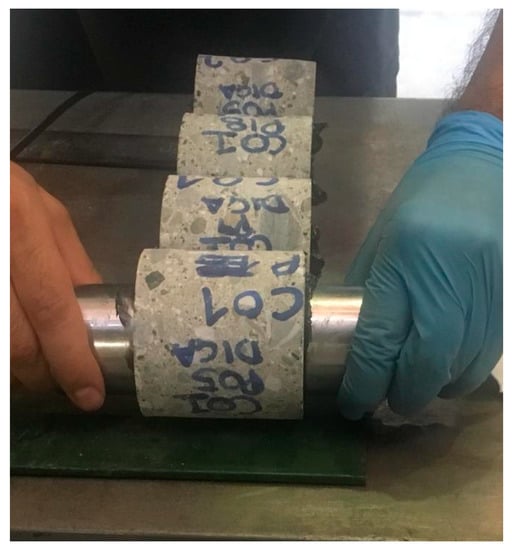 The above-illustrated results show the ability of the ultrasonic tests to evaluate the concrete strength if the ultrasonic velocity measurement is carried out directly on the sample. Therefore, in situ ultrasonic tests could be used to estimate the compressive concrete strength by applying the expression reported in the previous paragraph, in which, however, the in situ ultrasonic velocity values are corrected with those measured on the extracted sample by adopting, for example, an average correction value given by the ratio between Vc,core and Vc,insitu. This proposal is also consistent with other studies (e.g., [12,15]).