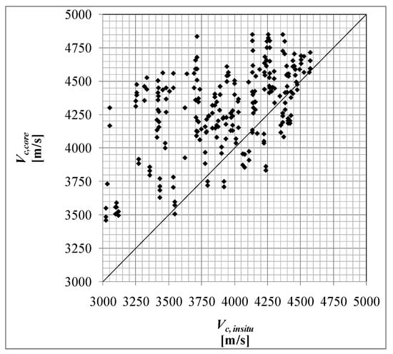 In situ direct ultrasonic velocity (Vc,insitu) test vs. ultrasonic velocity test samples (Vc,core).