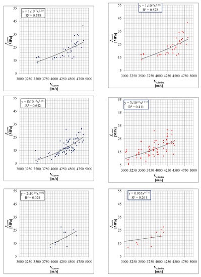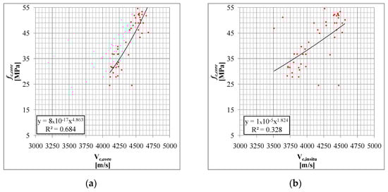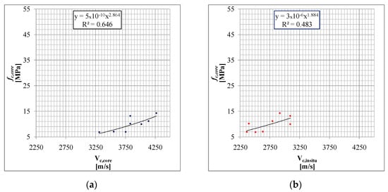 In Figure 12, the results of the ultrasonic velocity NDTs are compared with the result of the compression tests. In Figure 12, 45 data triples of the University of Basilicata experiment [48] are reported, considering the relationships between Vc,core-fc,core and Vc,insitu-fc,core in Figure 12a whereas in Figure 12b; the best fit of the data is reported.