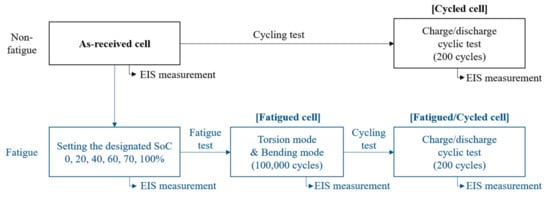 In this study, the effect of fatigue stress on the LIBs with different initial SoCs was investigated for the first time. Ultrathin pouch-type lithium-ion polymer batteries (Li-Pos) with bendability were used for the sake of the mechanical fatigue test, because a large number of flexible batteries are not commercially available, although various types of flexible LIBs have been developed at the research level [15,16,17,18,19,20,21]. The ultrathin pouch-type Li-Pos with different initial SoCs were subjected to repeated mechanical fatigue stress and then galvanostatically cycled 200 times. Since the main degradation mechanisms in the fatigued flexible batteries are delamination and cracking, leading to an increase in the contact resistance between the components, electrochemical impedance spectroscopy (EIS), which is capable of evaluating the internal electrochemical resistance of the battery, was used in this study. Moreover, a puncturing test was performed to investigate the effect of torsional stress on the separator, which is important for safety concerns with LIBs.