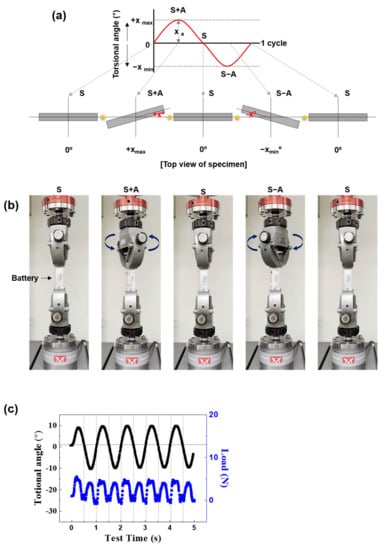 The torsional fatigue test conditions: (a) scheme of the phase changes in a sinusoidal wave, (b) torsional testing machine portraying the flexible conditions, and (c) fatigue load changes based on the rotation of the battery.
