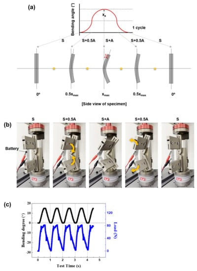 The bending fatigue test conditions: (a) scheme of the phase changes in a sinusoidal wave, (b) bending testing machine portraying the flexible conditions, and (c) fatigue load changes based on the rotation of the battery.