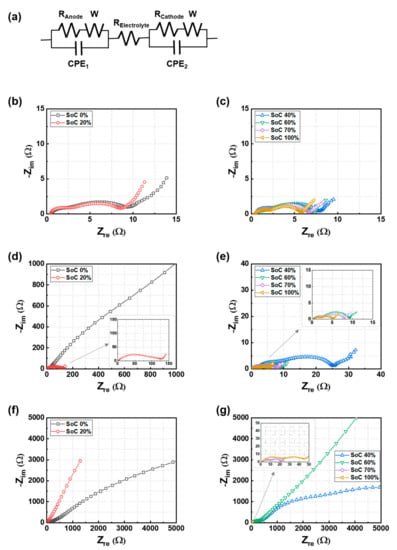 (a) Equivalent electrical circuit and the Nyquist plots for the different SoC cells under the conditions of (b,c) as-received, (d,e) after the fatigue test, and (f,g) after the fatigue and cycling test.