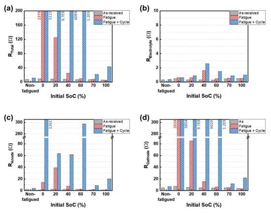 (a) total resistance (RTotal), (b) electrolyte resistance (RE), (c) anode resistance (RA), and (d) cathode resistance (RC) for the different SoC cells under the conditions of as-received, after the fatigue test, and after the fatigue and cycling test.